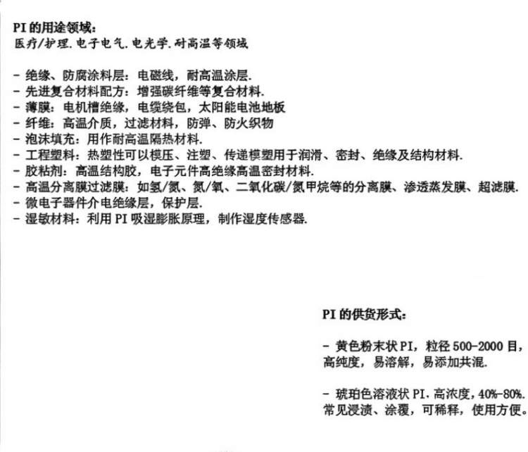 聚酰亚胺作为一种特种工程材料,已广泛应用在航空、航天、微电子、纳米、液晶、分离膜、激光等领域。上世纪60年代,各国都在将聚酰亚胺的研究、开发及利用列入 21世纪最有希望的工程塑料之一。