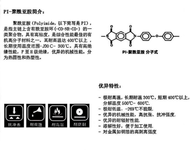 聚酰亚胺(Polyimide,简写为PI)指主链上含有酰亚胺环(-CO-NR-CO-)的一类聚合物,是综合性能******的有机高分子材料之一。